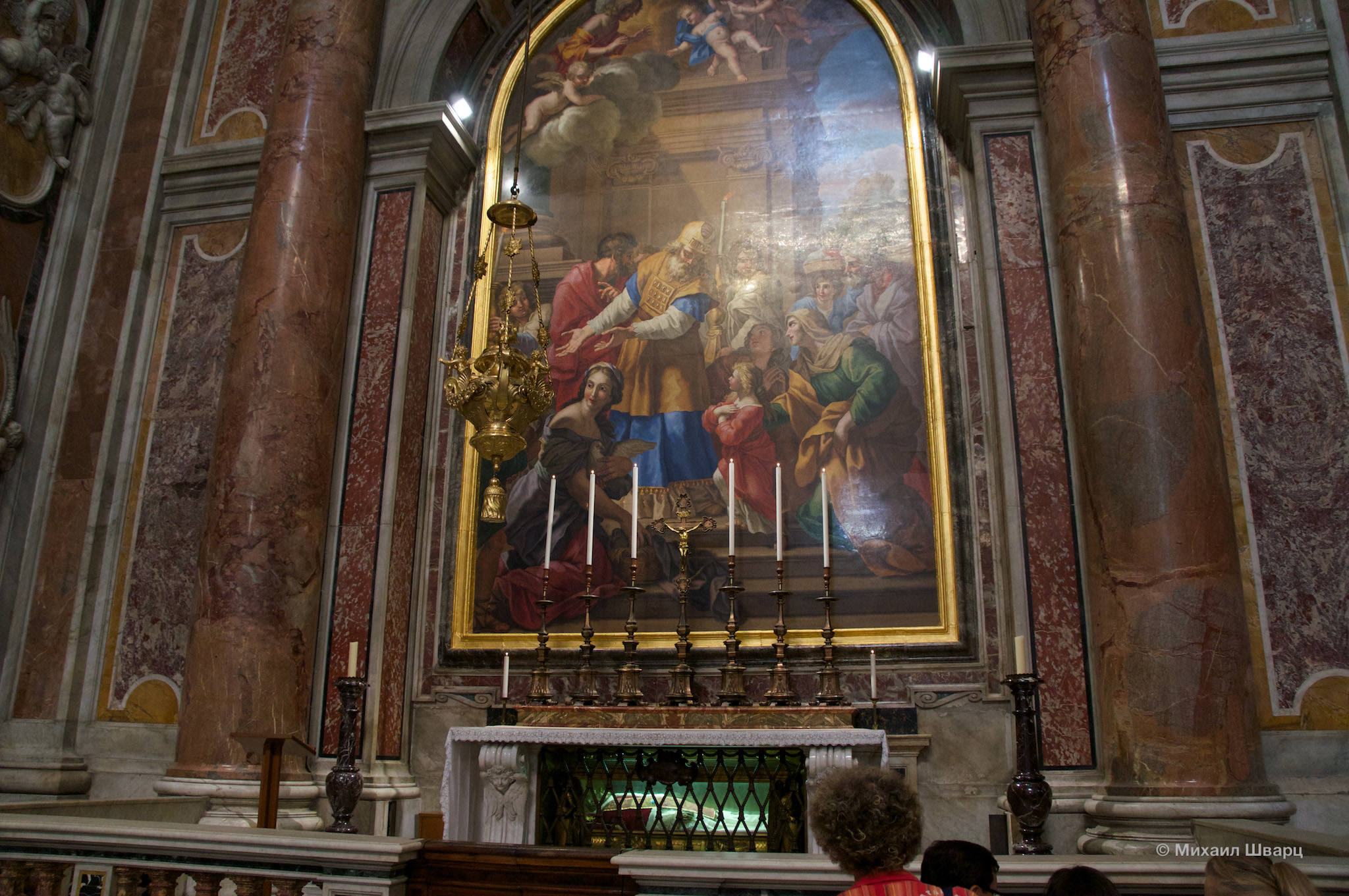 Пьета — великая работа Микеланджело «Оплакивание Христа», которая находится в первой правой капелле. От кроткой и печальной мраморной Пьеты невозможно оторвать взгляд. К сожалению, такие мощные произведения у всех вызывают разные чувства. В 1972 году Пьета едва не погибла. Психически неуравновешенный австралиец бросился на неё с молотком. После этого восстановленную Пьету скрыли за прочным стеклом.