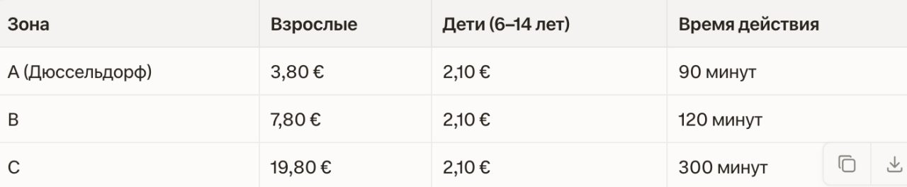 В Дюссельдорфе действует тарифная система VRR (Verkehrsverbund Rhein-Ruhr). Цена билета зависит не от конкретных «зон на карте», а от расстояния поездки, которое делится на несколько уровней (Preisstufe).