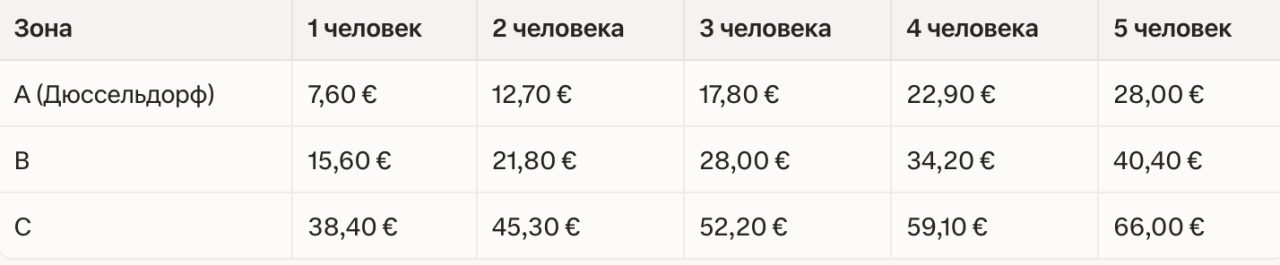 - DüsseldorfCard: до 3 взрослых или 2 взрослых + 2 детей (4–14 лет)