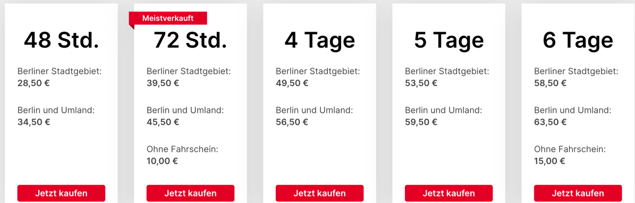 Если общественный транспорт не нужен (например, у вас уже есть другой проездной), приобретите Berlin WelcomeCard Der Klassiker на 72 часа (10€) или 6 дней (15€). Только скидки на 170 достопримечательностей.